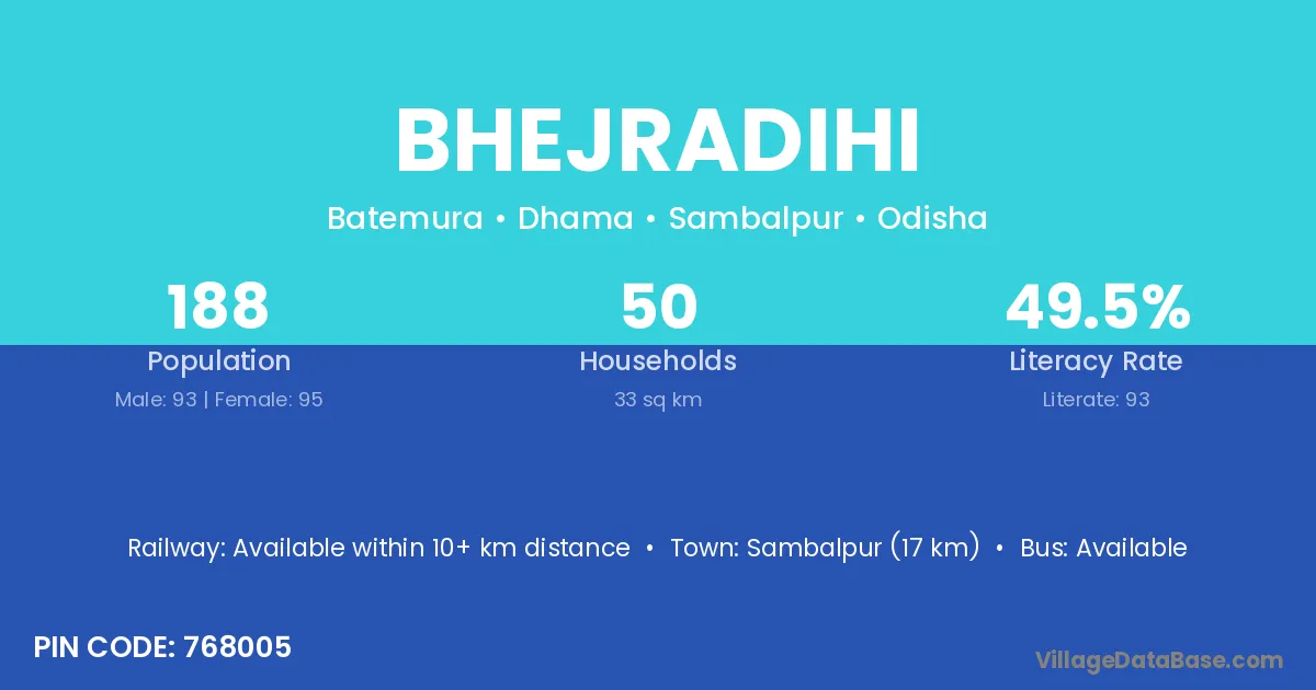 Sambalpur (17 km) is the nearest town to Bhejradihi village for major economic activities and is located approximately 17 km away.