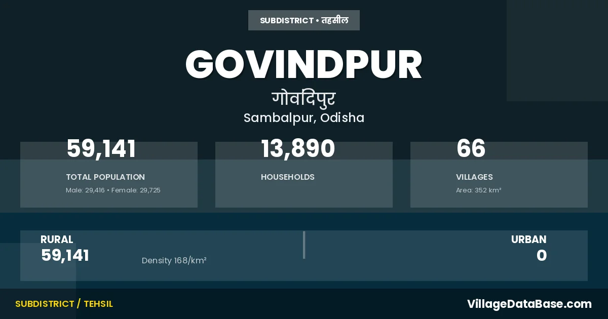 According to the 2011 census The total area of Govindpur Tehsil is 352 km², with a population of 59141 people. The population density is 168 inhabitants per square kilometre, and there are approximately 13890 houses in the sub district.