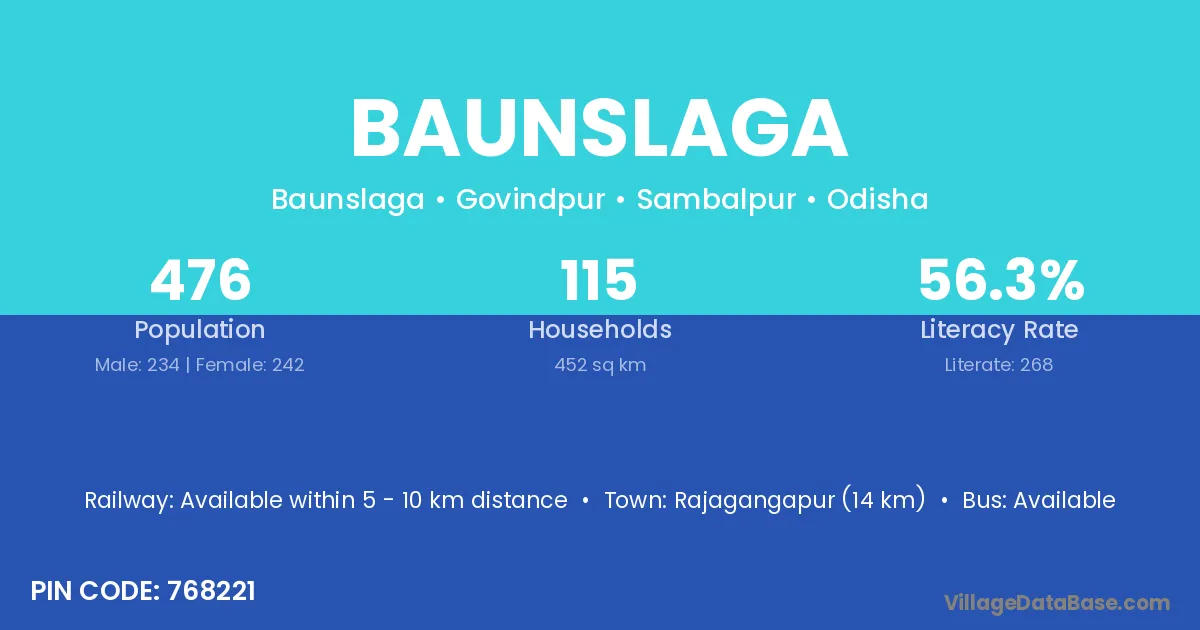 Rajagangapur (14 km) is the nearest town to Baunslaga village for major economic activities and is located approximately 14 km away.