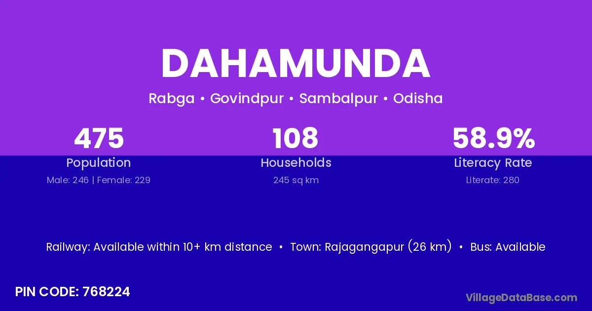 Rajagangapur (26 km) is the nearest town to Dahamunda village for major economic activities and is located approximately 26 km away.