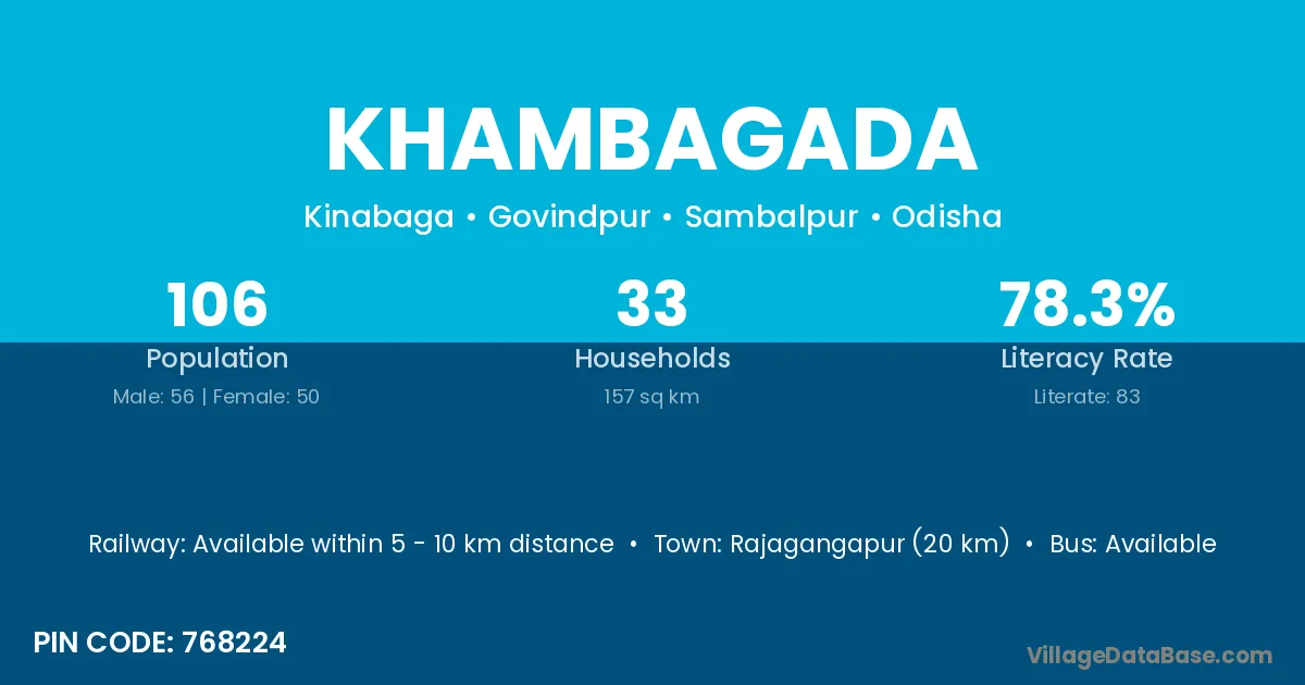 Rajagangapur (20 km) is the nearest town to Khambagada village for major economic activities and is located approximately 20 km away.