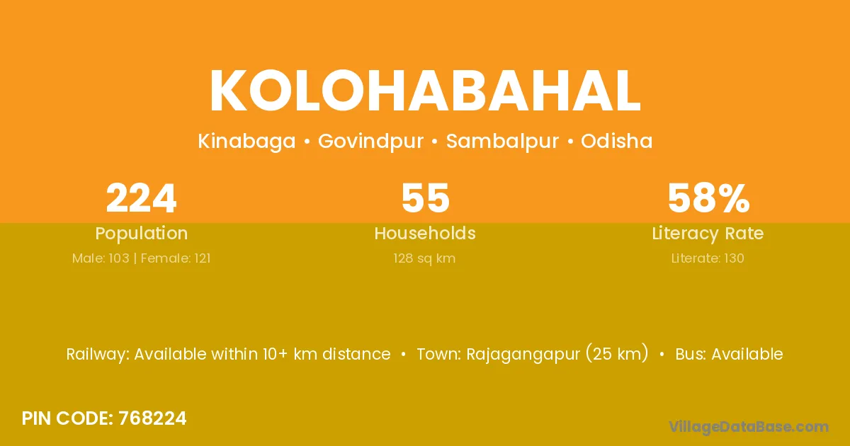 Rajagangapur (25 km) is the nearest town to Kolohabahal village for major economic activities and is located approximately 25 km away.