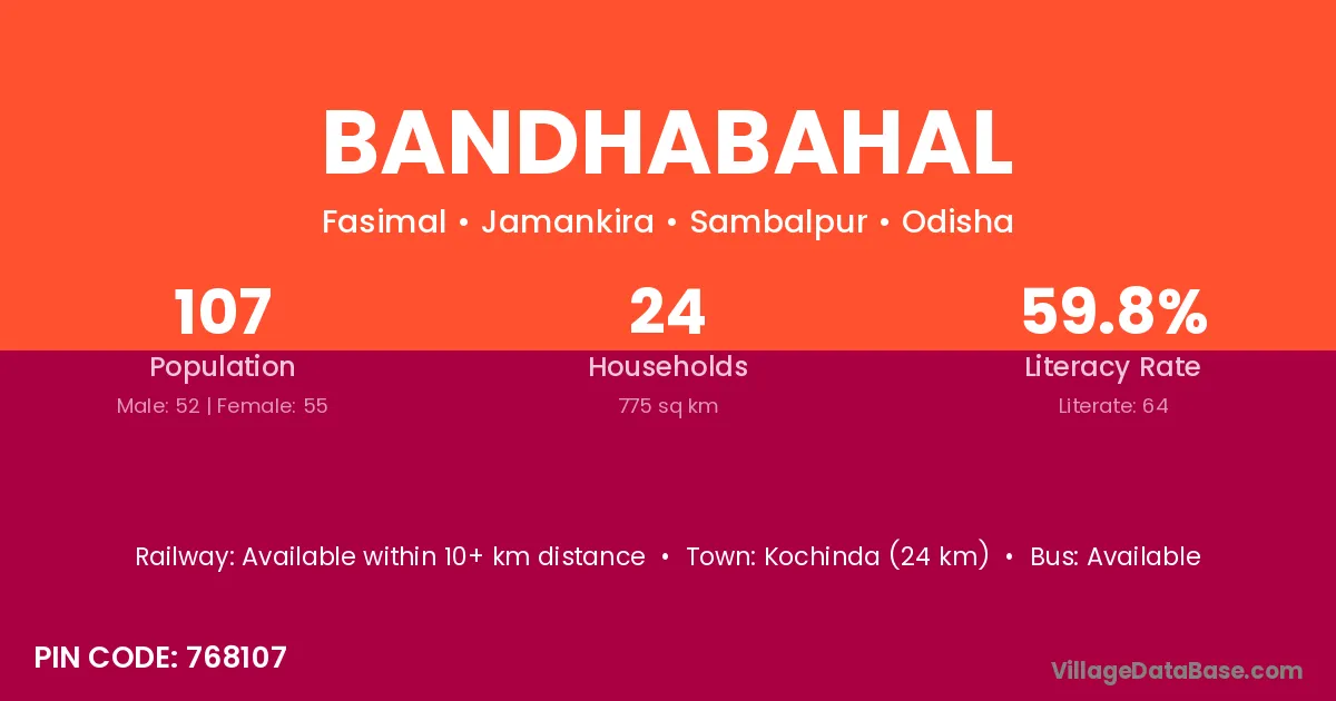 Bandhabahal village has a total population of 107 people, of which 52 are males and 55 are females.