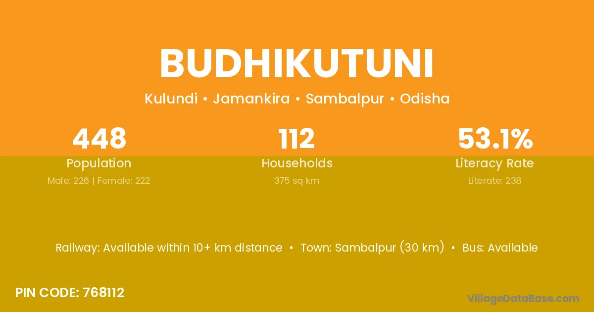 Sambalpur (30 km) is the nearest town to Budhikutuni village for major economic activities and is located approximately 30 km away.