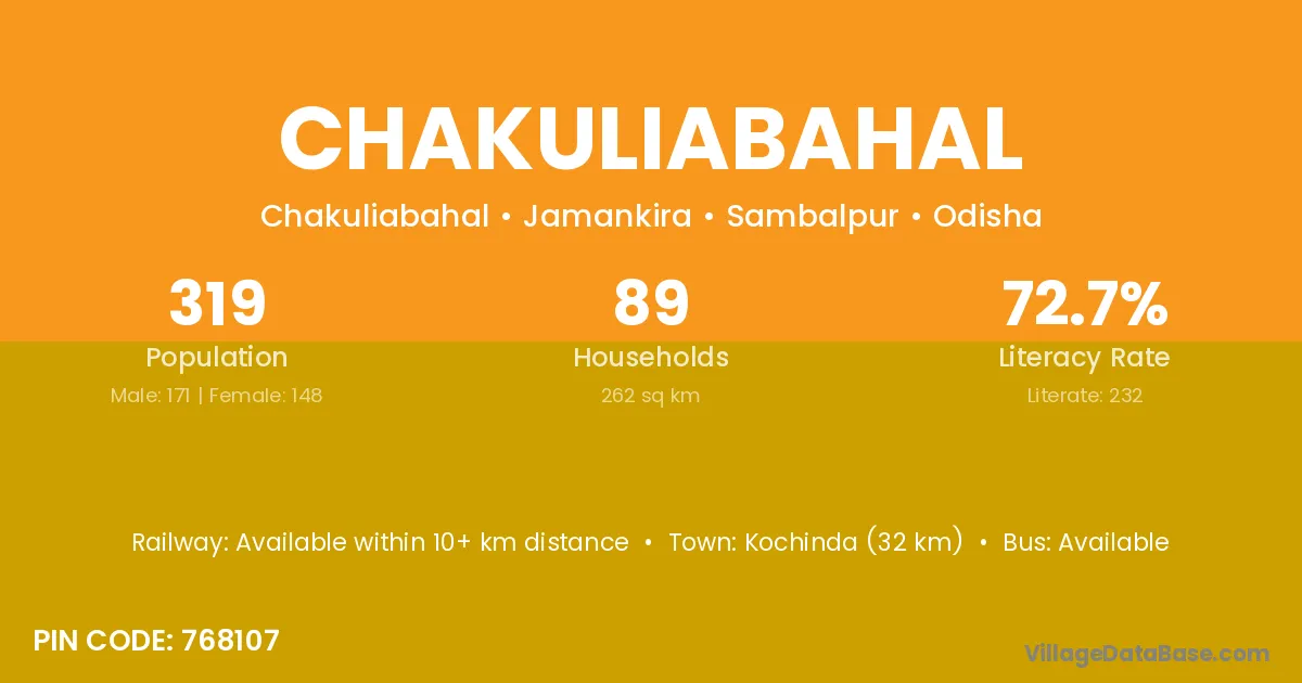 Kochinda (32 km) is the nearest town to Chakuliabahal village for major economic activities and is located approximately 32 km away.