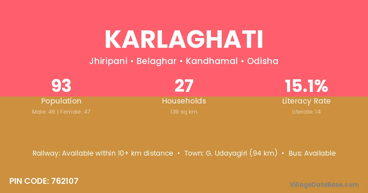 Sambalpur (41 km) is the nearest town to Karlaghati village for major economic activities and is located approximately 41 km away.