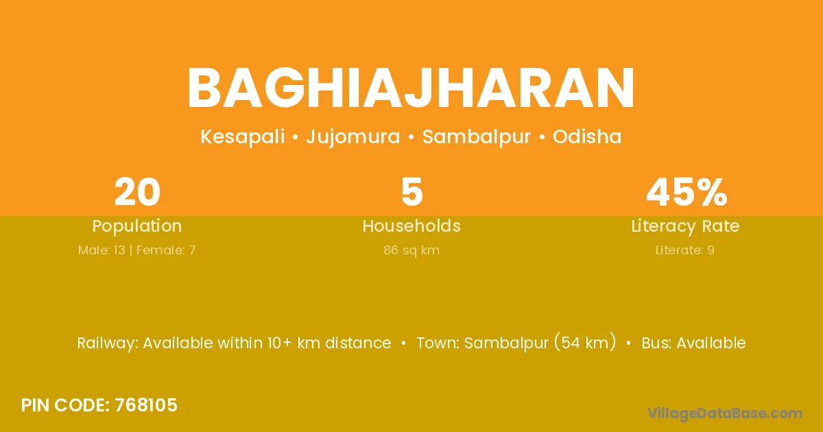 Sambalpur (54 km) is the nearest town to Baghiajharan village for major economic activities and is located approximately 54 km away.