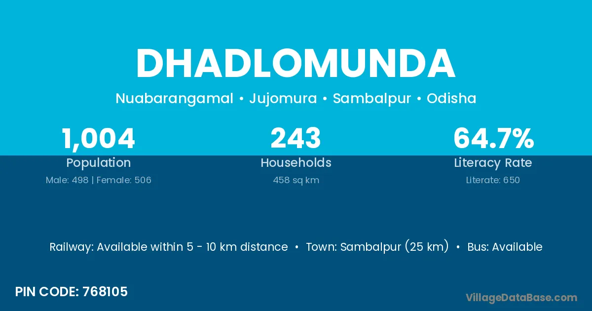 Sambalpur (25 km) is the nearest town to Dhadlomunda village for major economic activities and is located approximately 25 km away.