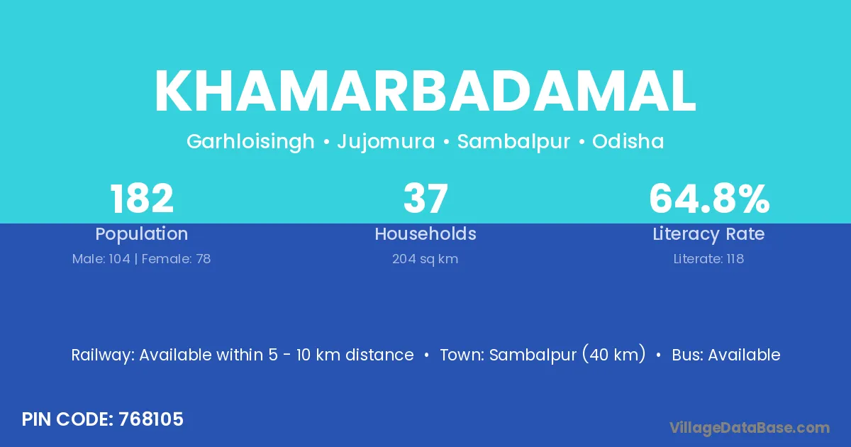 Sambalpur (40 km) is the nearest town to Khamarbadamal village for major economic activities and is located approximately 40 km away.