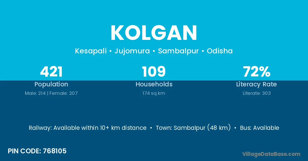 Sambalpur (48 km) is the nearest town to Kolgan village for major economic activities and is located approximately 48 km away.