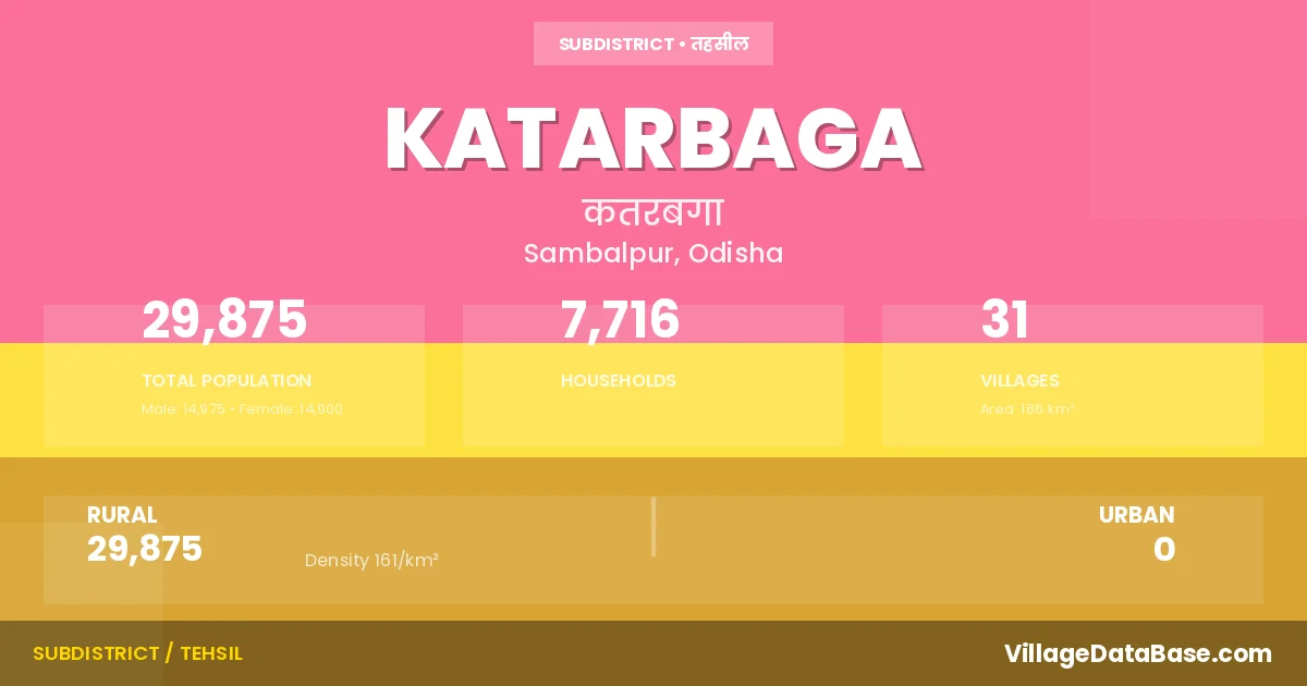 Katarbaga is a town and Tehsil in the Sambalpur district of the Odisha. In India, a Tehsil is a subdivision of a district responsible for the administration and revenue collection of a specific area within the district. Tehsils play a crucial role in the local governance structure, contributing significantly to the development and administration of their communities.