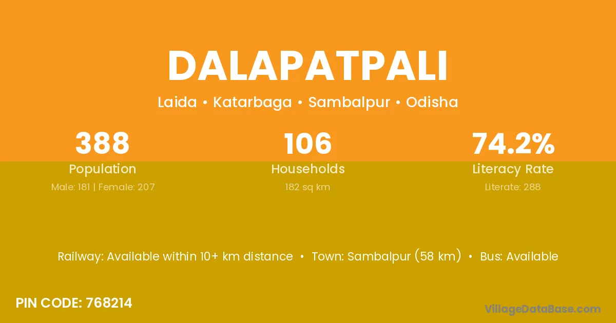 Sambalpur (58 km) is the nearest town to Dalapatpali village for major economic activities and is located approximately 58 km away.