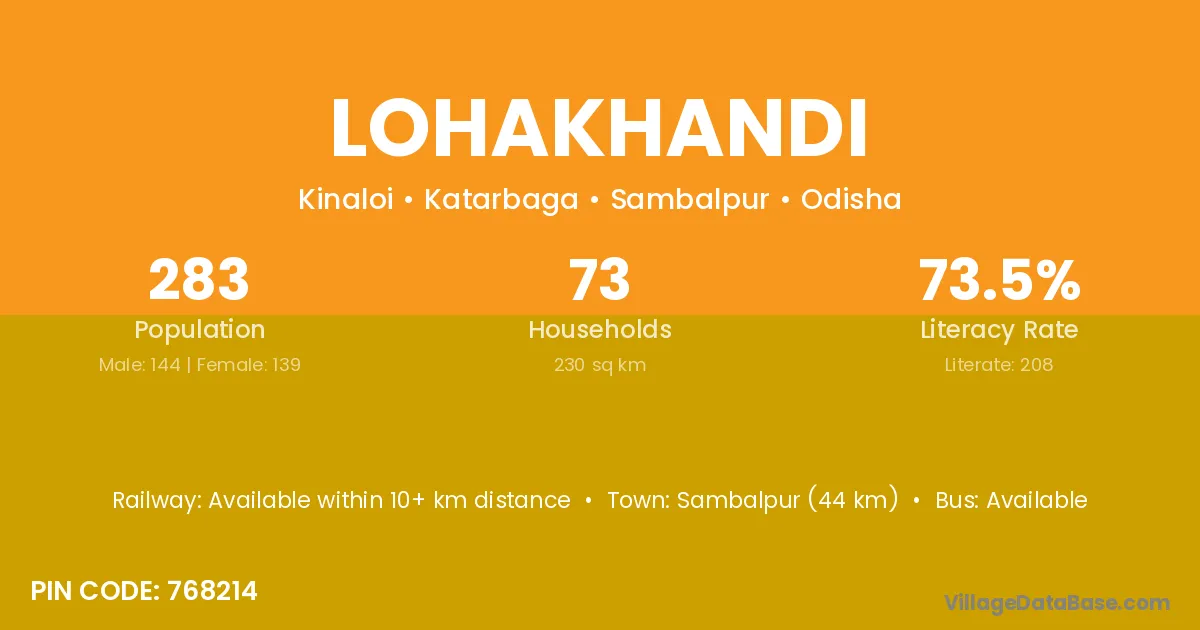 Sambalpur (44 km) is the nearest town to Lohakhandi village for major economic activities and is located approximately 44 km away.