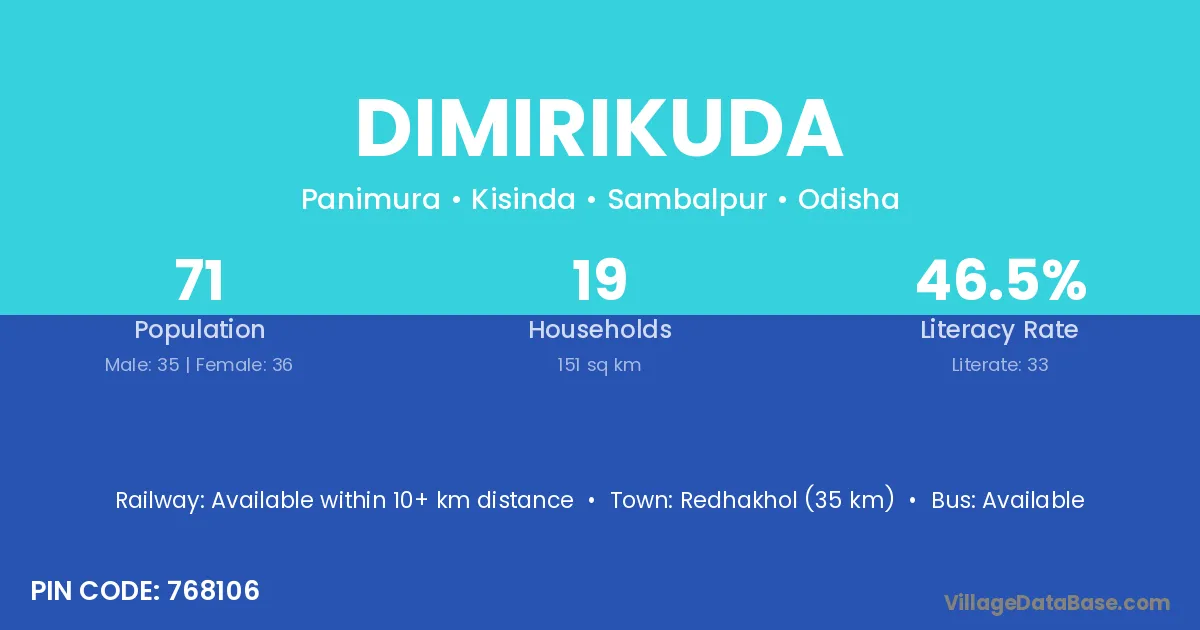 Redhakhol (35 km) is the nearest town to Dimirikuda village for major economic activities and is located approximately 35 km away.
