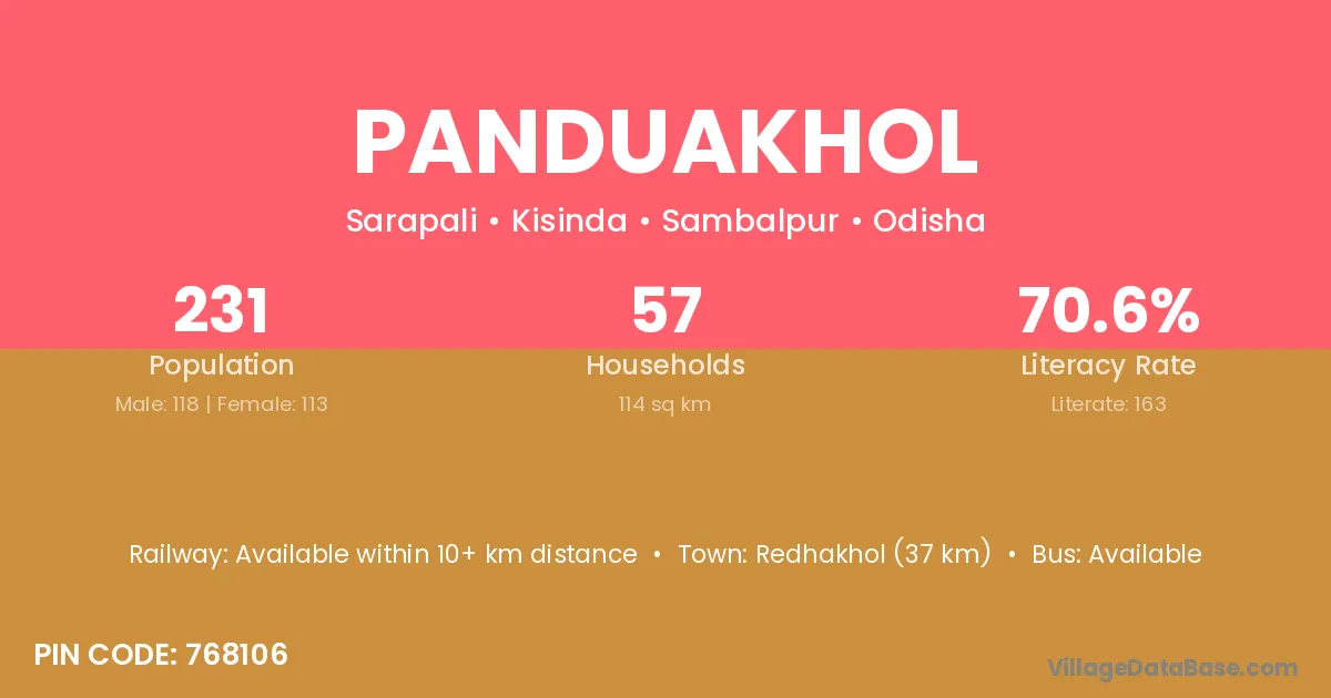 Panduakhol village has a total population of 231 people, of which 118 are males and 113 are females.