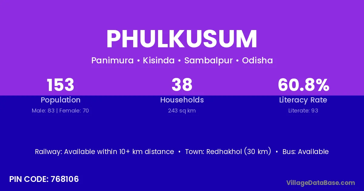 Redhakhol (30 km) is the nearest town to Phulkusum village for major economic activities and is located approximately 30 km away.