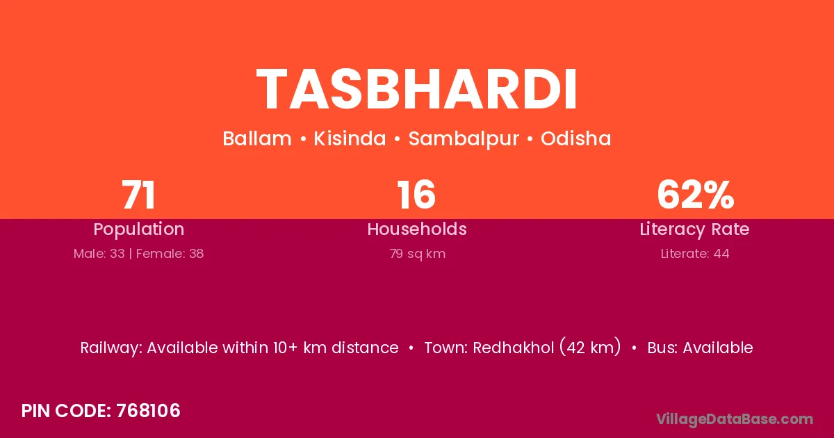 Tasbhardi village has a total population of 71 people, of which 33 are males and 38 are females.