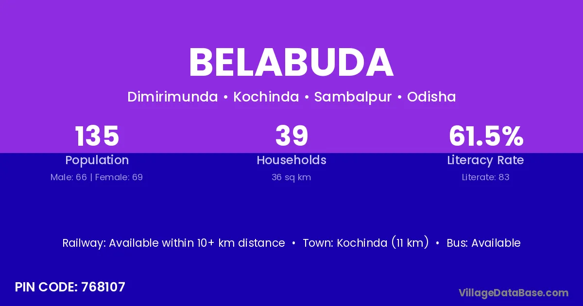 Kochinda (11 km) is the nearest town to Belabuda village for major economic activities and is located approximately 11 km away.