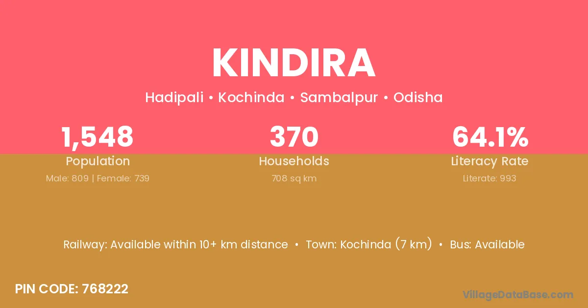 Kindira village is located in the Kochinda Tehsil of the Sambalpur district in Odisha .