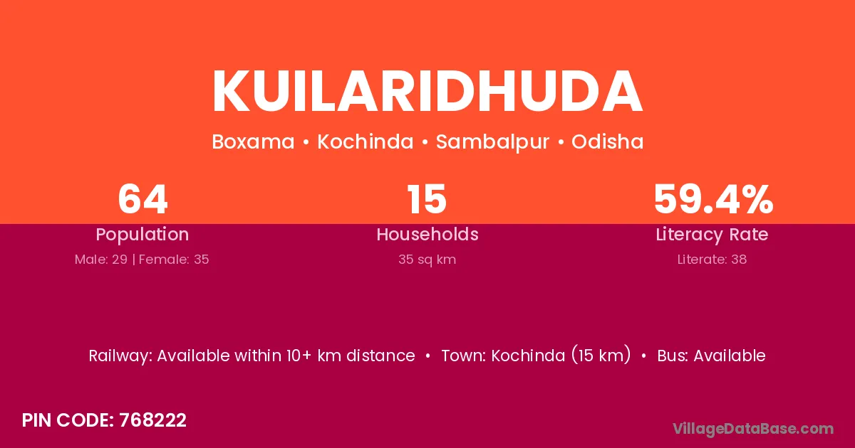 Kochinda (15 km) is the nearest town to Kuilaridhuda village for major economic activities and is located approximately 15 km away.