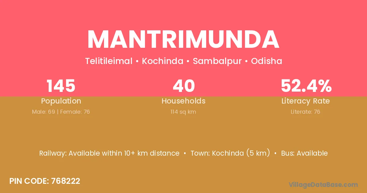 Mantrimunda village has a total population of 145 people, of which 69 are males and 76 are females.
