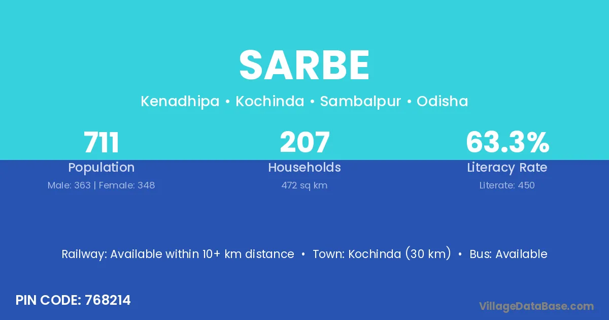 Kochinda (30 km) is the nearest town to Sarbe village for major economic activities and is located approximately 30 km away.