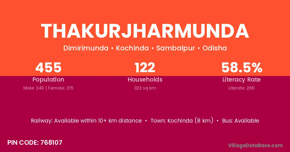 Kochinda (8 km) is the nearest town to Thakurjharmunda village for major economic activities and is located approximately 8 km away.