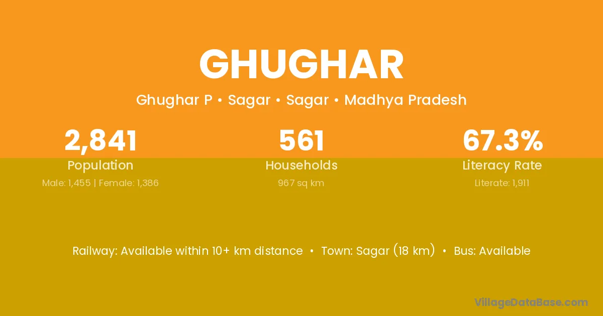Kochinda (41 km) is the nearest town to Ghughar village for major economic activities and is located approximately 41 km away.