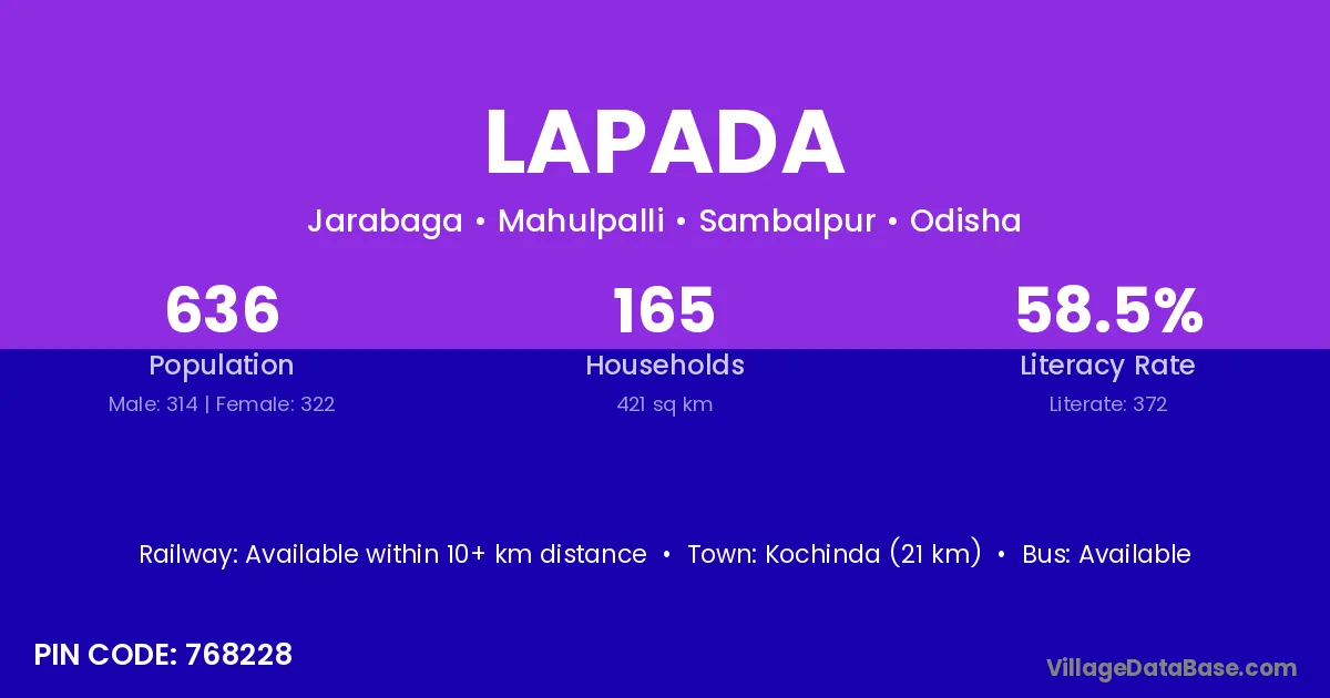 Kochinda (21 km) is the nearest town to Lapada village for major economic activities and is located approximately 21 km away.