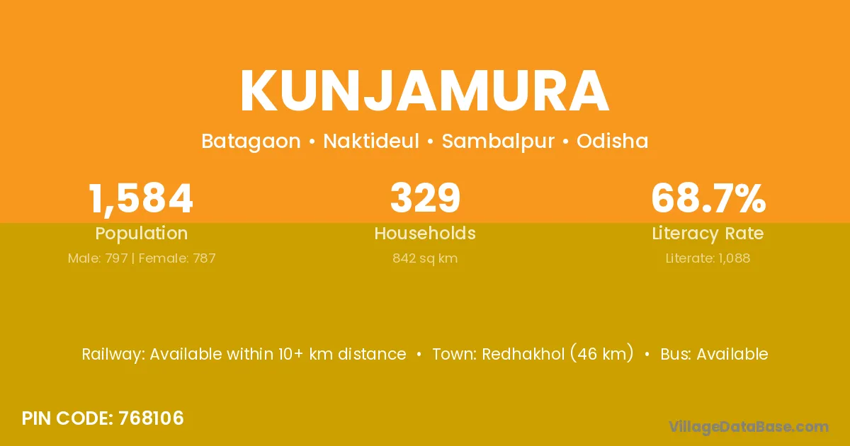 Redhakhol (46 km) is the nearest town to Kunjamura village for major economic activities and is located approximately 46 km away.