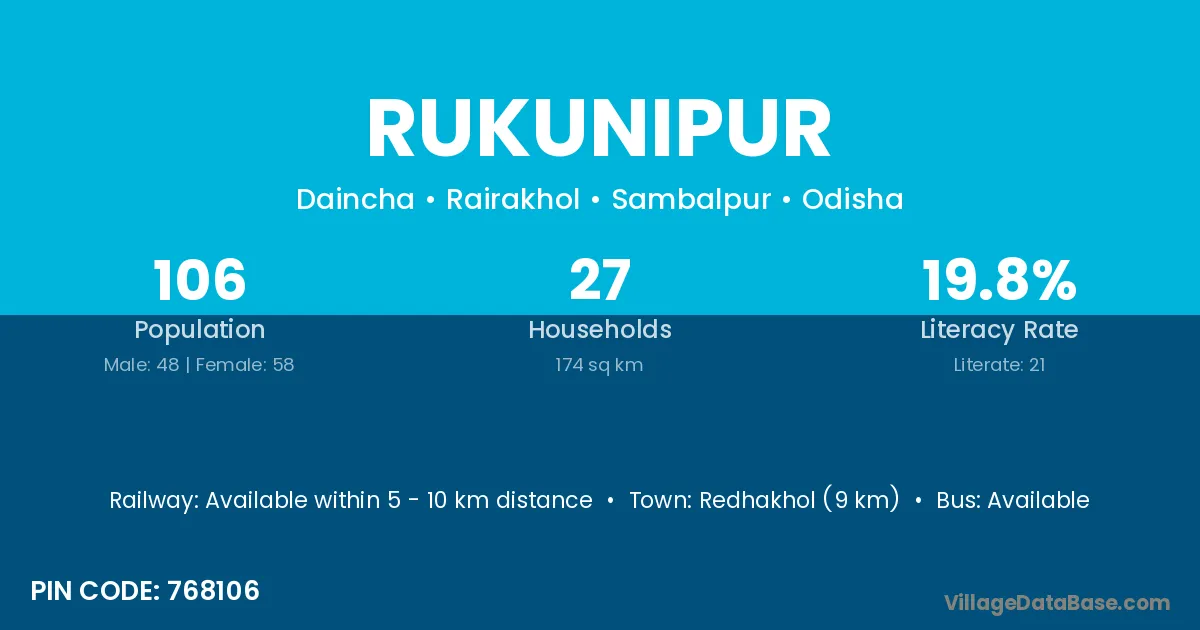 Redhakhol (9 km) is the nearest town to Rukunipur village for major economic activities and is located approximately 9 km away.