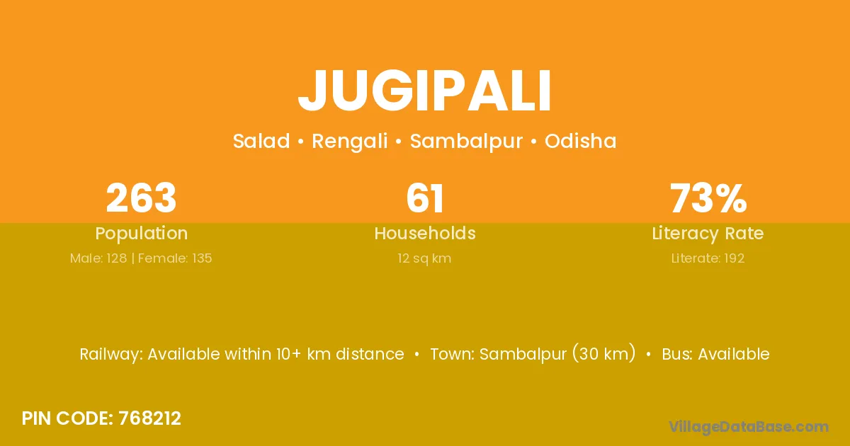 Sambalpur (30 km) is the nearest town to Jugipali village for major economic activities and is located approximately 30 km away.