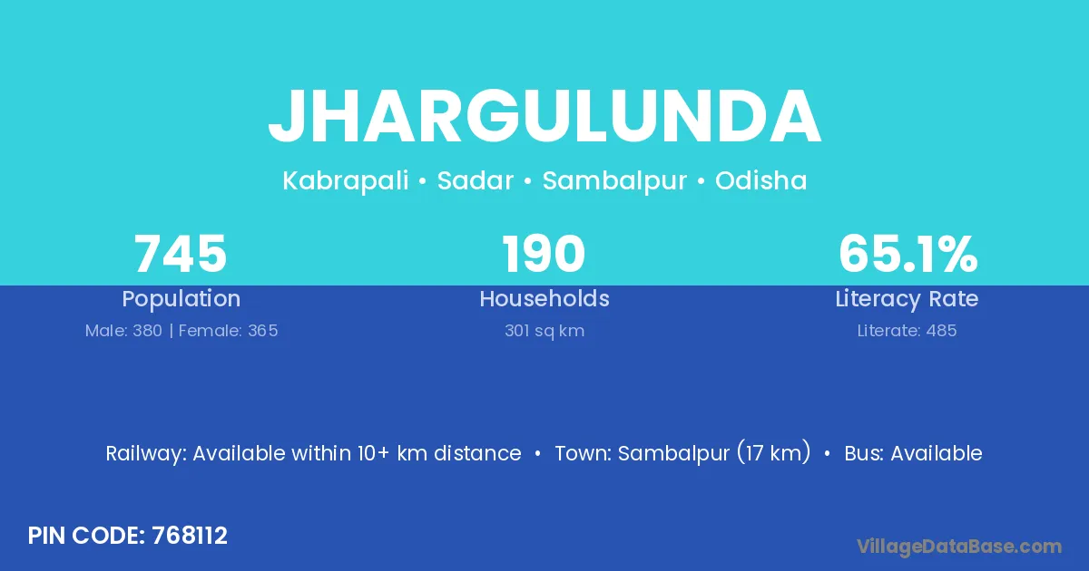 Jhargulunda village has a total population of 745 people, of which 380 are males and 365 are females.