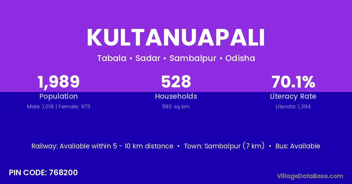 Sambalpur (7 km) is the nearest town to Kultanuapali village for major economic activities and is located approximately 7 km away.