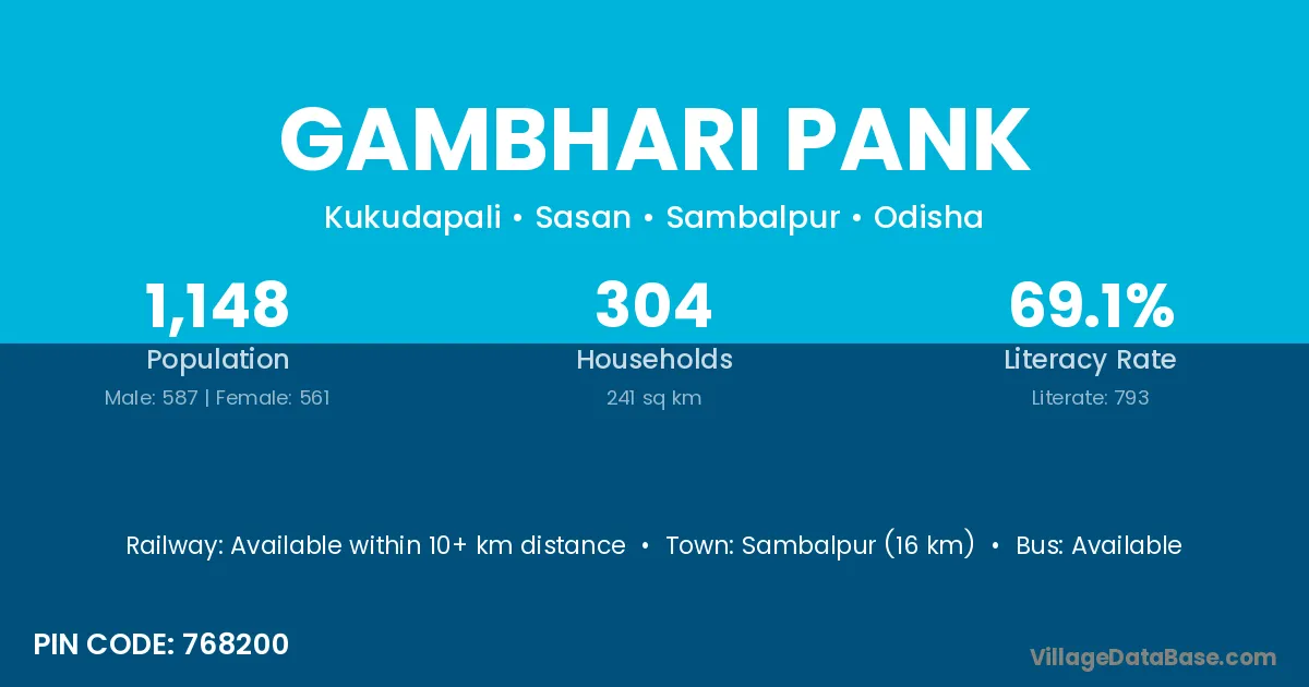 Sambalpur (16 km) is the nearest town to Gambhari Pank village for major economic activities and is located approximately 16 km away.