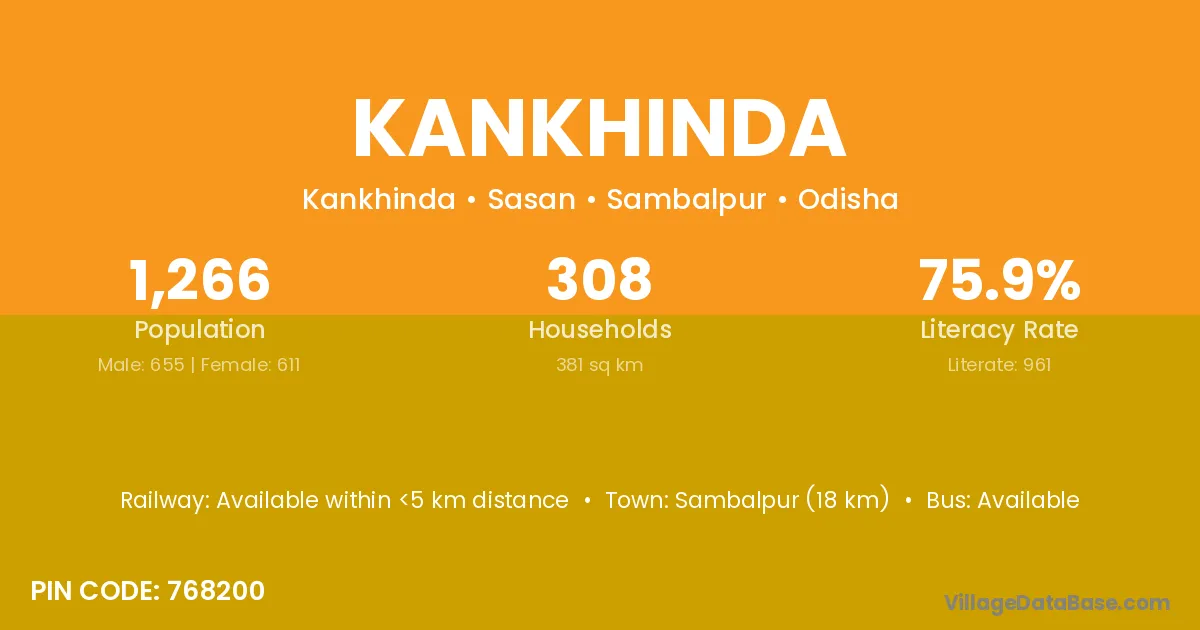 Sambalpur (18 km) is the nearest town to Kankhinda village for major economic activities and is located approximately 18 km away.