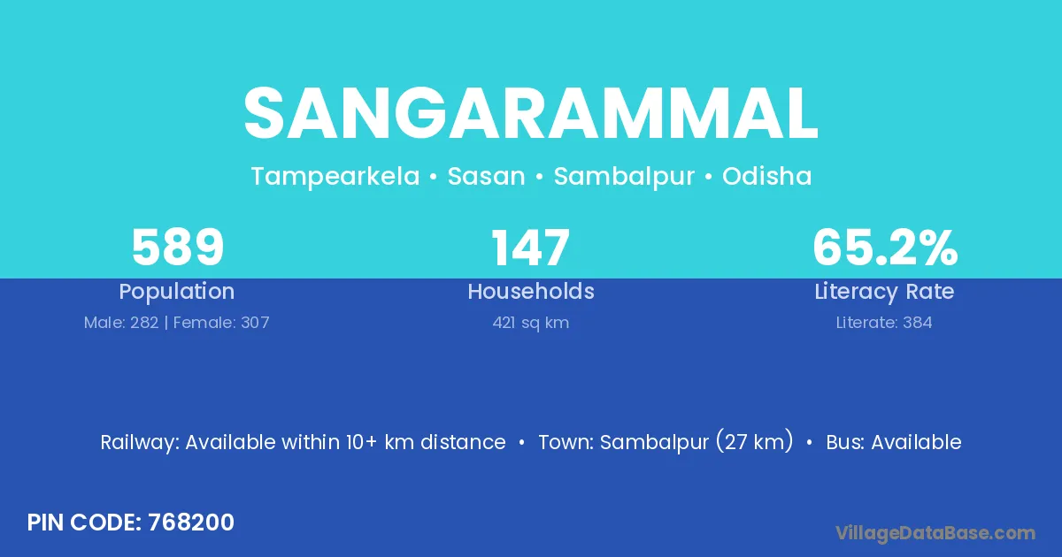 Sambalpur (27 km) is the nearest town to Sangarammal village for major economic activities and is located approximately 27 km away.