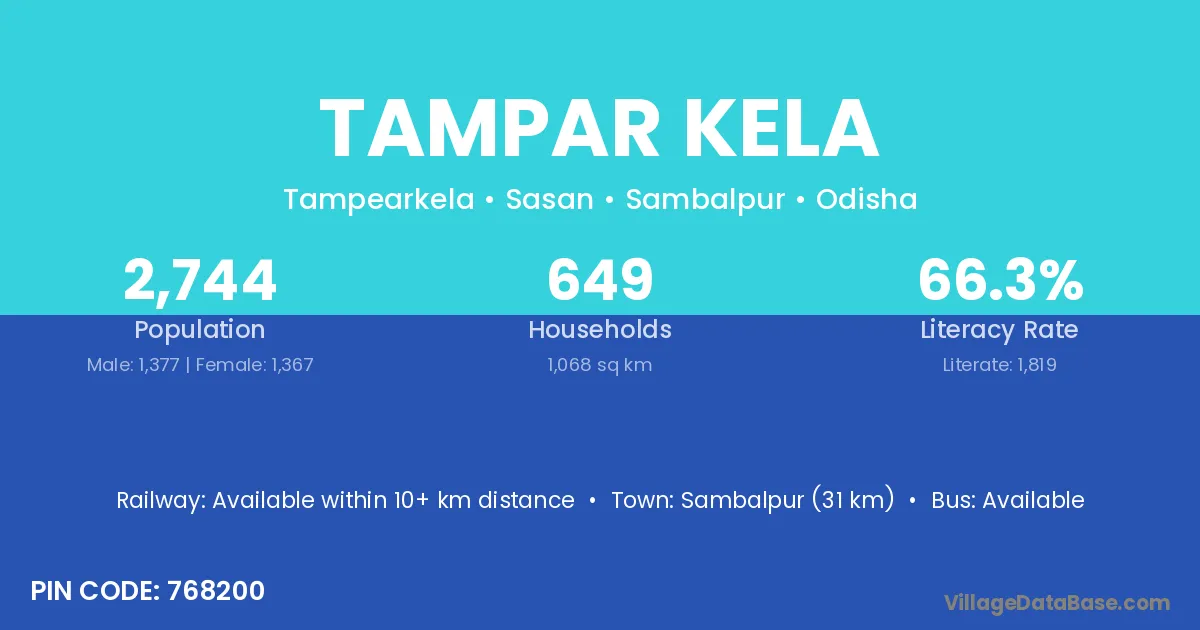 Sambalpur (31 km) is the nearest town to Tampar Kela village for major economic activities and is located approximately 31 km away.