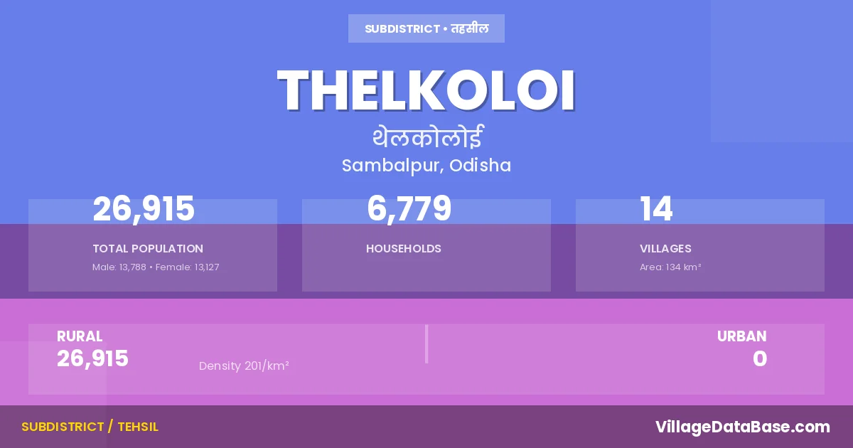 Thelkoloi is a town and Tehsil in the Sambalpur district of the Odisha. In India, a Tehsil is a subdivision of a district responsible for the administration and revenue collection of a specific area within the district. Tehsils play a crucial role in the local governance structure, contributing significantly to the development and administration of their communities.