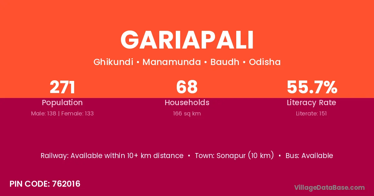 Binika (15 km) is the nearest town to Gariapali village for major economic activities and is located approximately 15 km away.