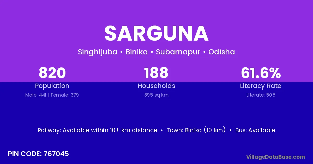 Binika (10 km) is the nearest town to Sarguna village for major economic activities and is located approximately 10 km away.