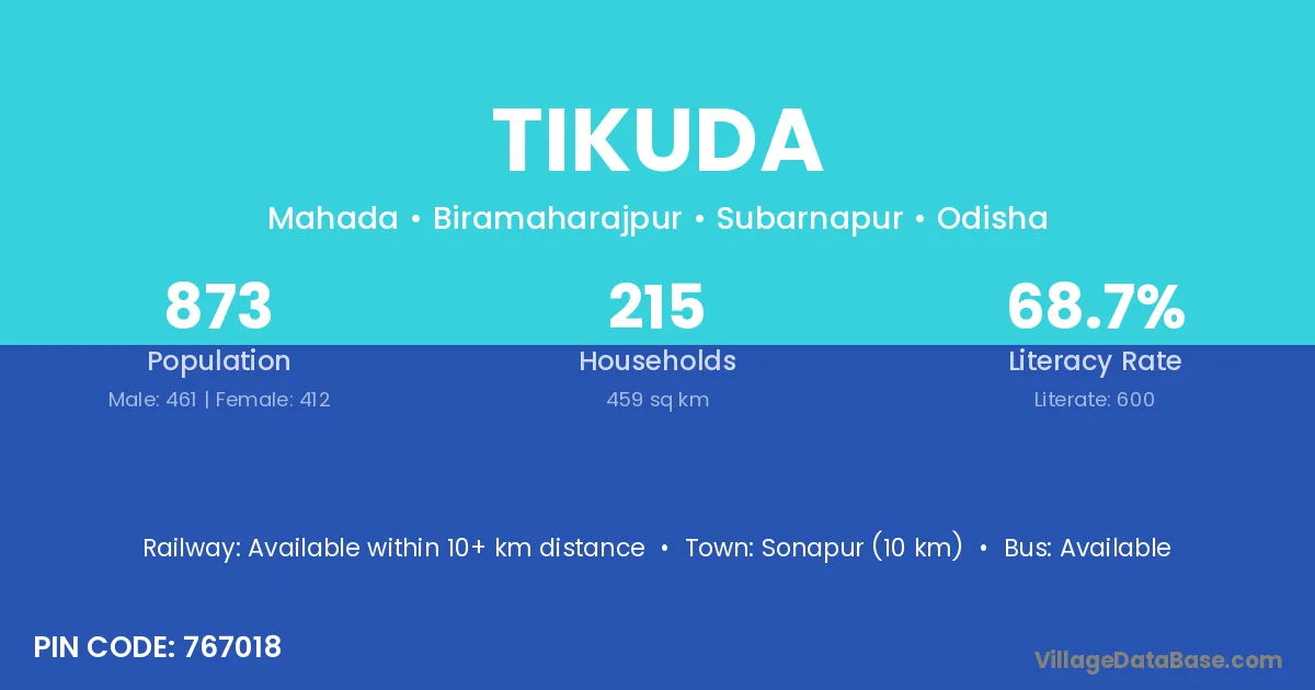 Tikuda village has a total population of 873 people, of which 461 are males and 412 are females.