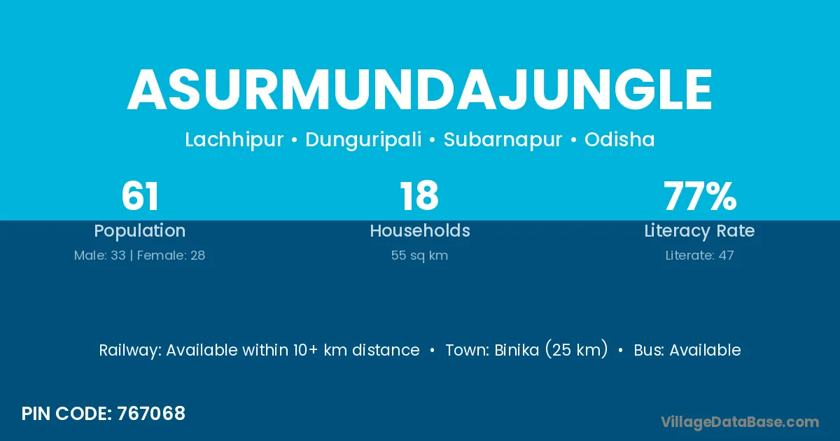 The literacy rate of Asurmundajungle village is 77.05%. Male literacy stands at 72.73% and female literacy at 82.14%.