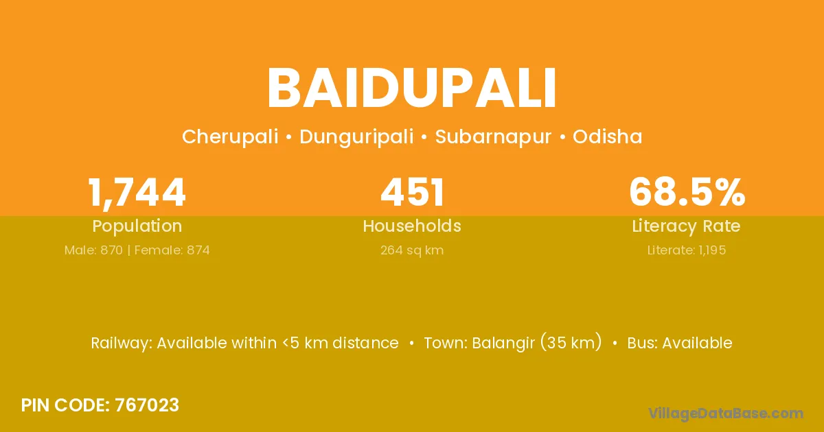 Balangir (35 km) is the nearest town to Baidupali village for major economic activities and is located approximately 35 km away.