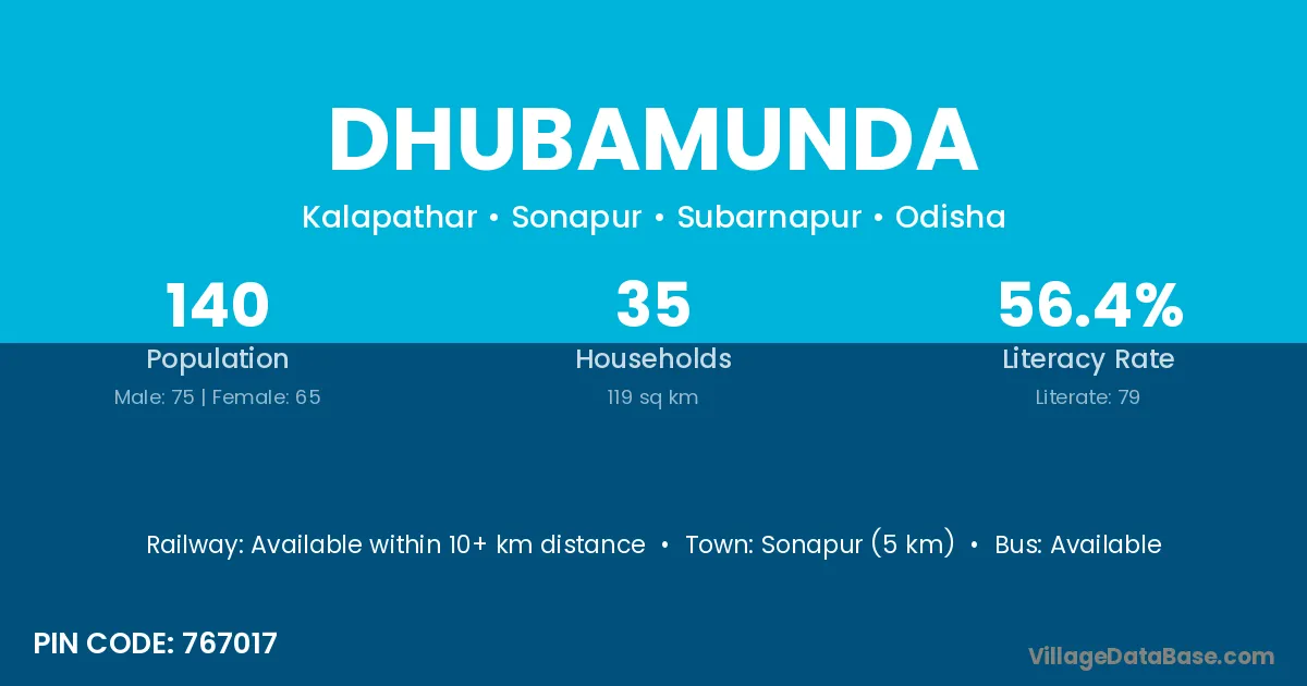 Dhubamunda village has a total population of 140 people, of which 75 are males and 65 are females.