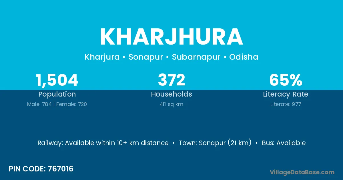 Kharjhura village has a total population of 1,504 people, of which 784 are males and 720 are females.