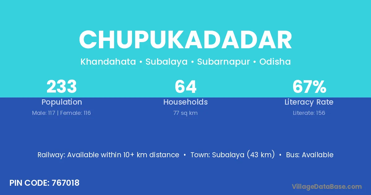 Chupukadadar village has a total population of 233 people, of which 117 are males and 116 are females.
