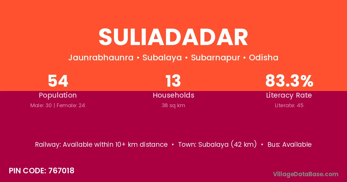 Subalaya (42 km) is the nearest town to Suliadadar village for major economic activities and is located approximately 42 km away.