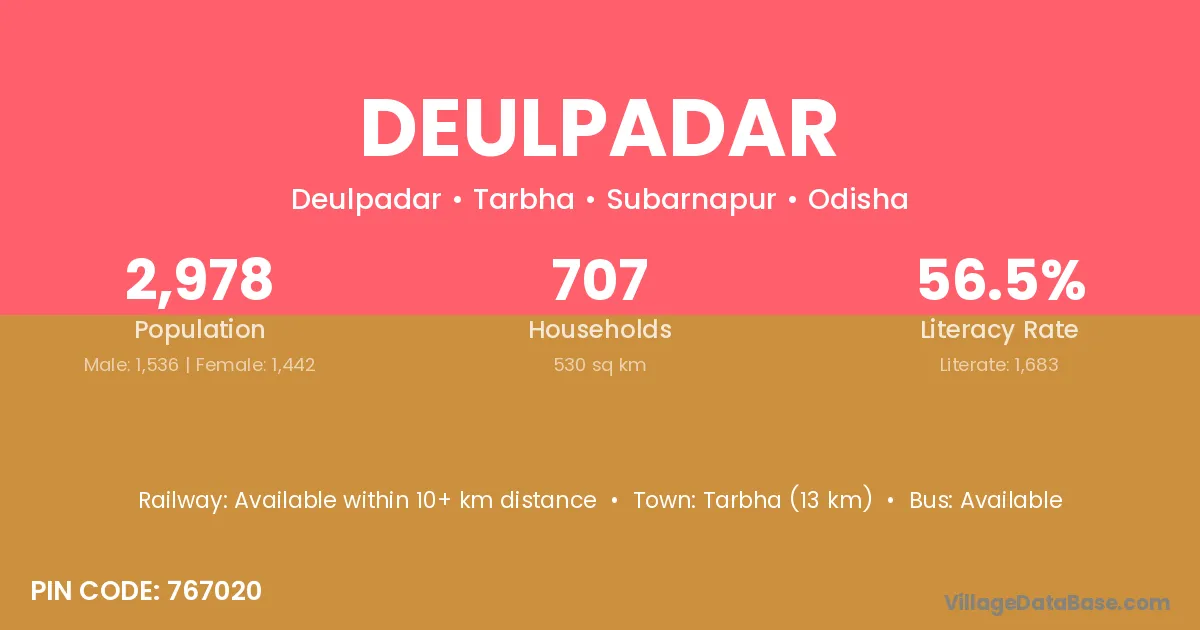 Tarbha (13 km) is the nearest town to Deulpadar village for major economic activities and is located approximately 13 km away.