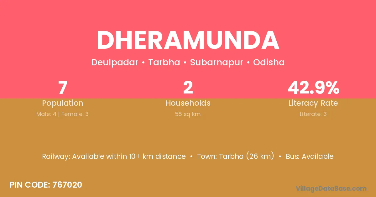 Tarbha (26 km) is the nearest town to Dheramunda village for major economic activities and is located approximately 26 km away.